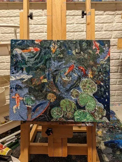 A busy and colorful mixed media painting. Studio stretched canvas with added fabrics and thick applications.