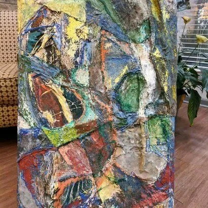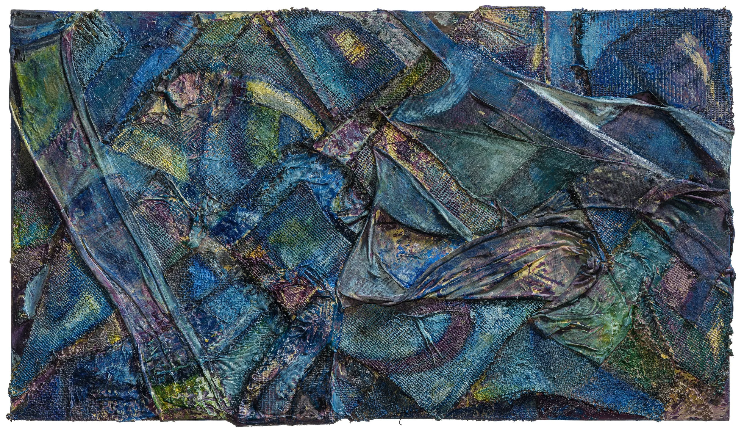 This painting is a very thick application of fabric, carpet, wood, tshirt, and more. This is a true conversation piece for a modern art collector.
